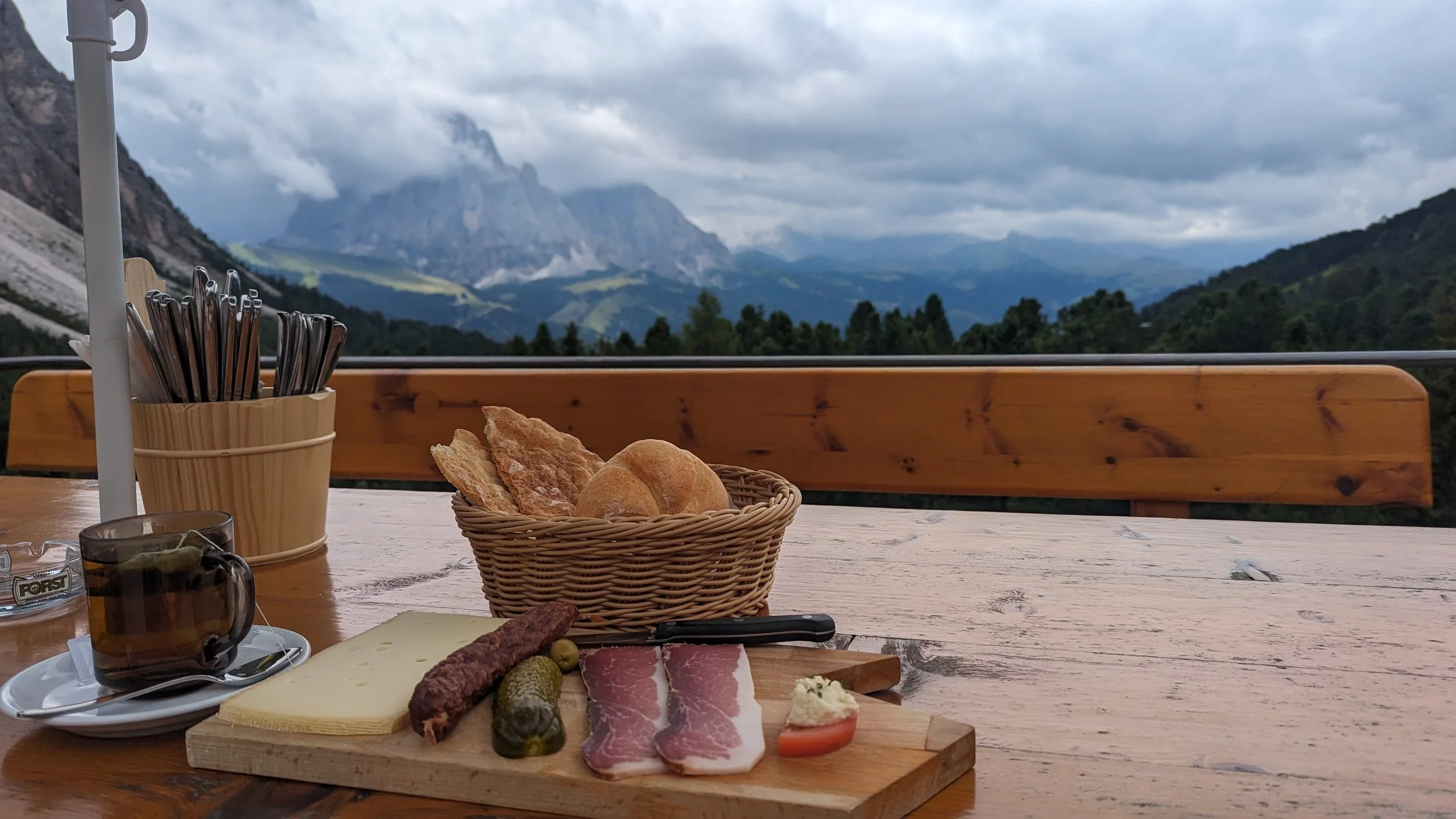 By the time I made it to Rifugio Firenze/Ragensburger Hutte it was just opening up and I snagged a great table. I started with a macchiato, then got a mint tea and the “Hut Board” which came with meat, cheese and bread. All so fresh. I ate half then made little mini sandwiches to eat later along the journey. I was sad because since it was only a 6 mile hike, I was halfway done at this point.